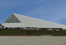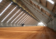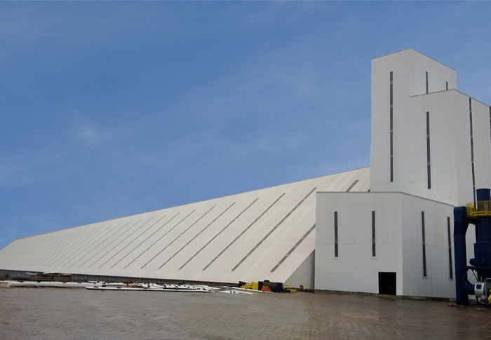 Galpão com altura de 25,54 m, largura de 50,00 m e comprimento de 370,00 m, com estrutura em pórticos de perfil “I”, atuando também como estrutura de transportadores suspensos no centro do armazém. Obra gerenciada pela Construtora Zuin.